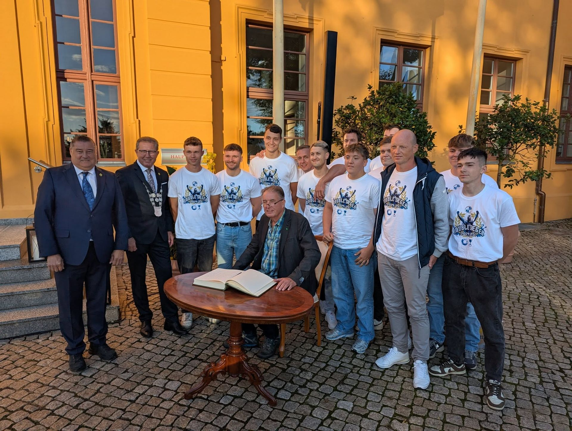 Die Teammitglieder um Ex- Coach Torsten Schilk durften sich anschließend mit der entsprechender Widmung in das Ehrenbuch der Reuterstadt eintragen.
